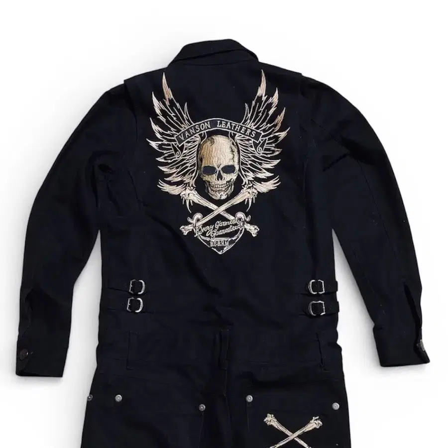 뒷면에는 브랜드 스테디셀러인 스컬 & 윙 자수가 새겨져 있으며, 옷깃에도 [ VANSON LEATHERS ] 로고가 있습니다.