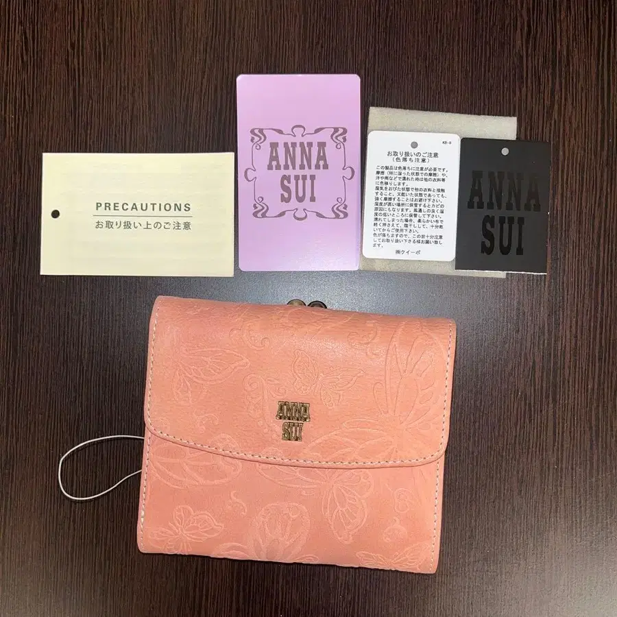택 포함 새상품 안나수이 살몬 핑크 소가죽 로고 나비 엠보 접이식 지갑
