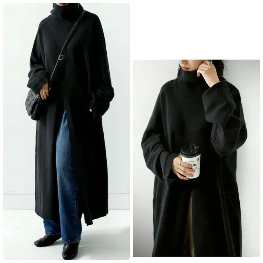 안티카 슬릿 니트 원피스 롱 하이넥 블랙