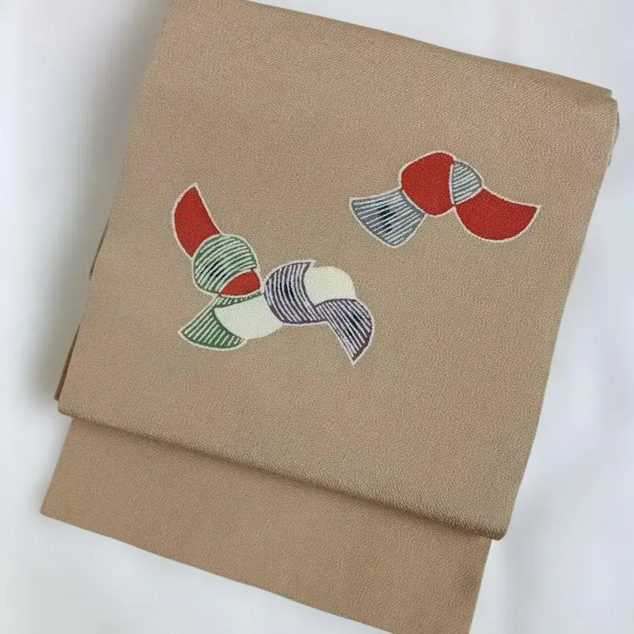베이지색 크레이프 원단에 길조 매듭 문양 염색 나고야 오비, 설날에