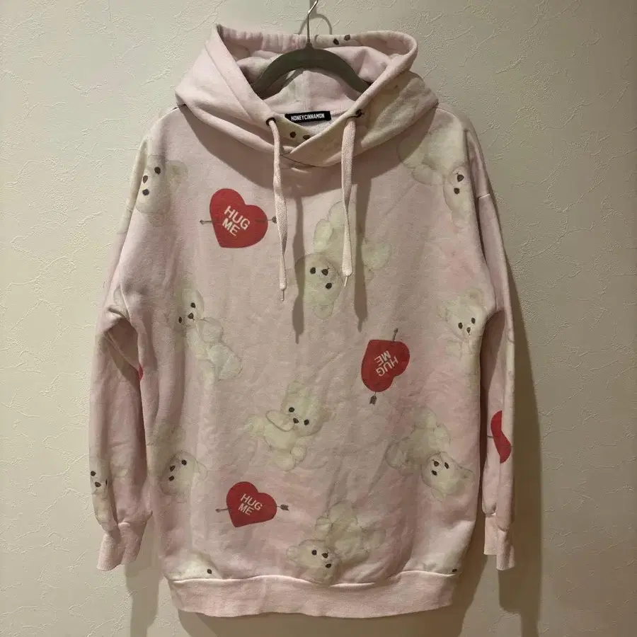 라이트 핑크 컬러에 곰돌이 & [HUG ME] 하트 모티브의 올 패턴 디자인이 사랑스러운 아이템입니다.