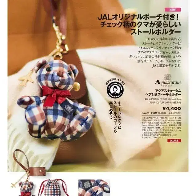 ◇ 세트 내용: 마스코트 포함 스톨 홀더, 비행기 참, 파우치 ◇ 사이즈: 스톨 홀더 본체/약 직경 16.5cm 19.5cm, 마스코트/약 세로 11cm x 가로 11cm x 폭 7cm, 파우치/약 세로 19cm x 가로 13cm x 폭 5cm ◇ 소재: 스톨 홀더/합성 피혁, 마스코트 파우치/폴리에스테르, 참/아연 합금 ◇ 중국산 (made in China) 곰의 왼발바닥에는 JAL 별주 증표인 비행기 자수가 있습니다. 마스코트와 같은 패턴의 JAL 오리지널 파우치와 비행기 참이 포함되어 있습니다. 편안한 코디도 NEW! JAL 한정 JAL 오리지널 파우치 포함! 체크 무늬 곰이 사랑스러운 스톨 홀더입니다. 다가오는 계절에 활약할 스톨 & 머플러 홀더는 아이코닉한 클럽 체크 무늬 곰 마스코트가 사랑스러움이 가득합니다. 빨간색 리본, 발바닥의 비행기 자수와 비행기 참, 파우치가 포함된 JAL 한정판 모델입니다. 네고 불가 스톨을 구매하고 충동 구매하게 되어 검토 부탁드립니다.