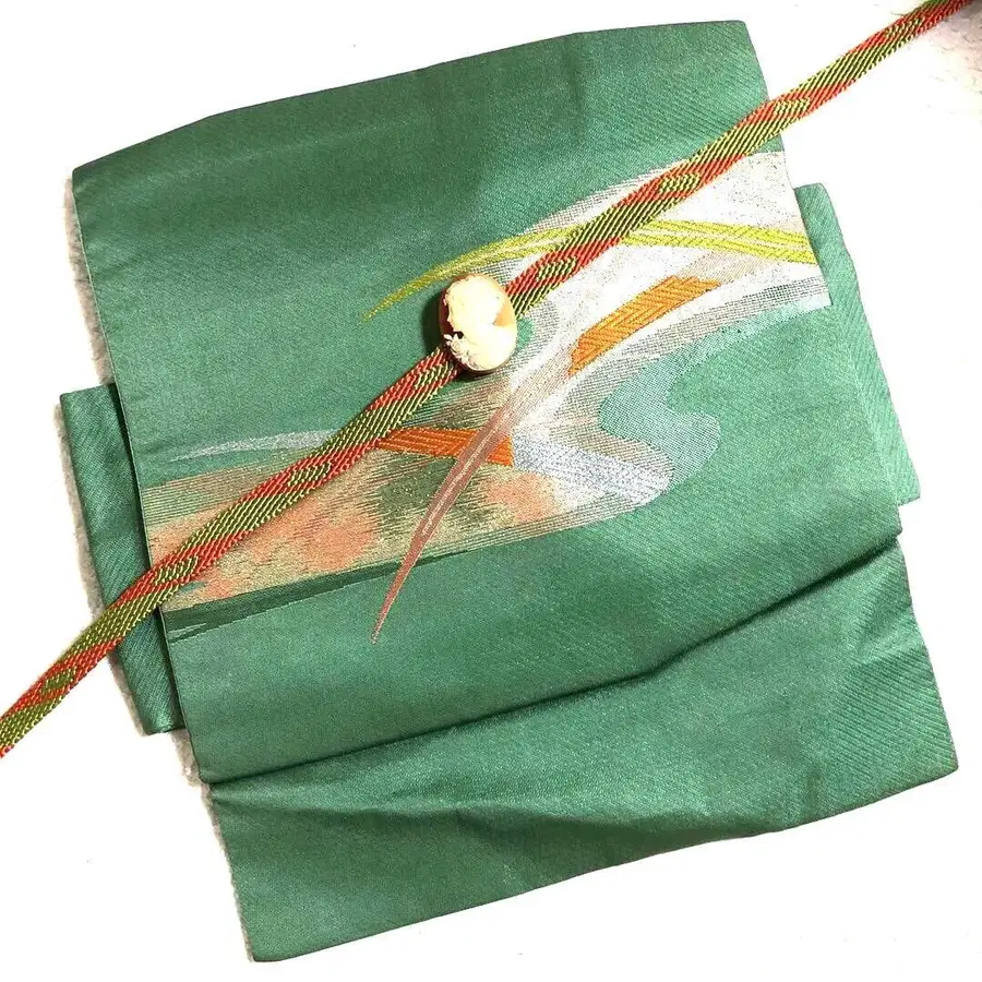 빈티지 화학 섬유 2부식 나고야 오비 상큼한 에메랄드