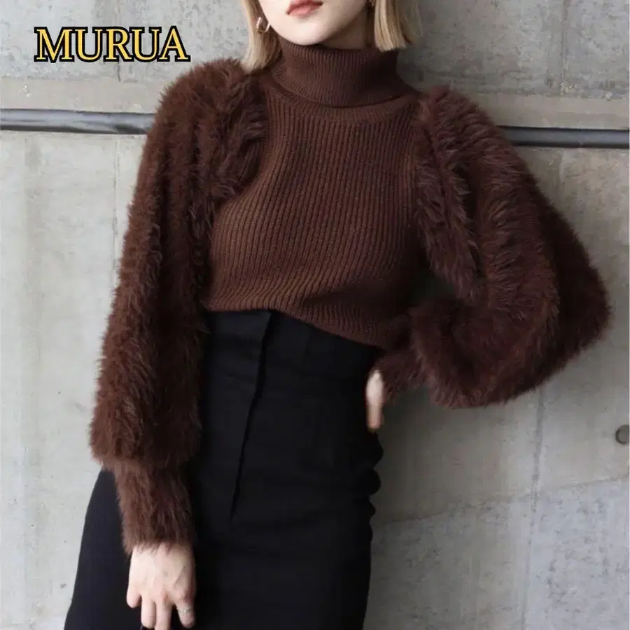 새상품급 무루아 페더 슬리브 타이트 니트 하이넥 브라운