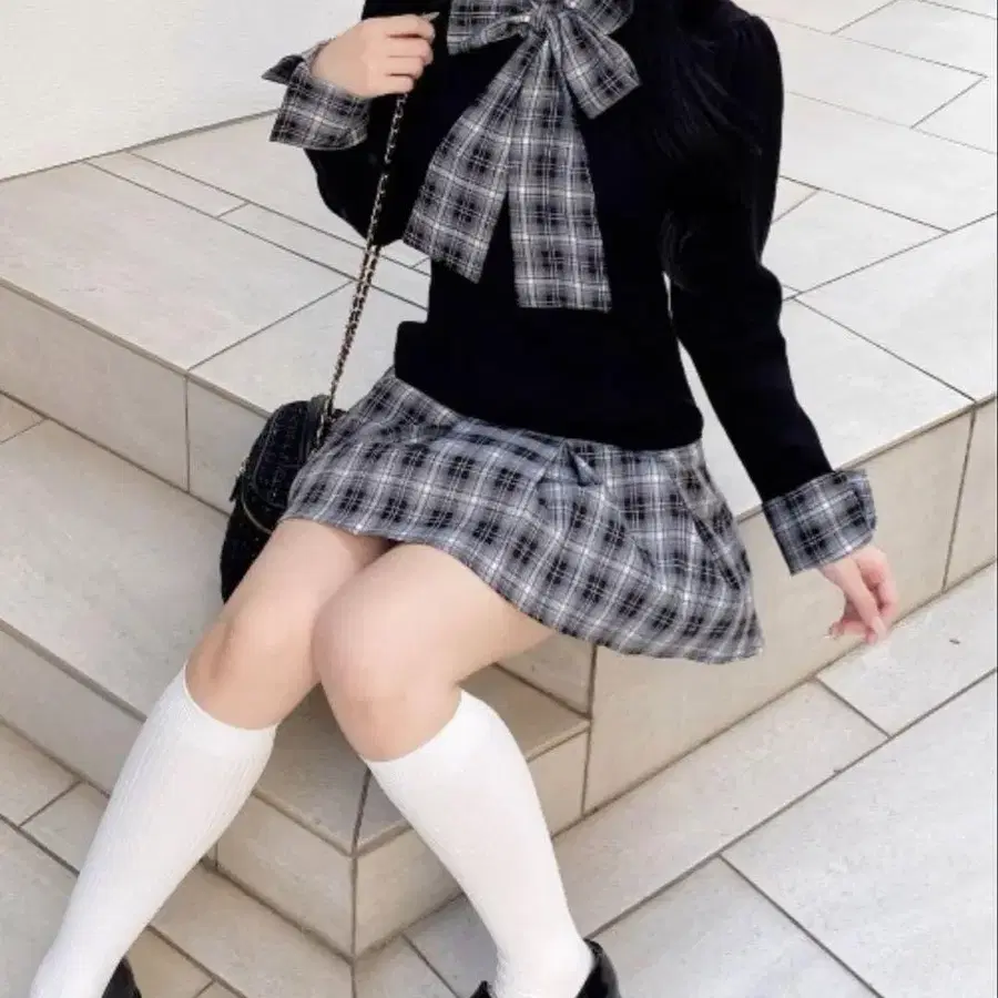 INGNI 체크 무늬 보타이 셔츠 도킹 니트 원피스