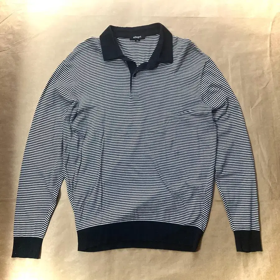 자동 번역되었어요. 원문보기네이비와 화이트 스트라이프 디자인의 긴팔 피케 셔츠.