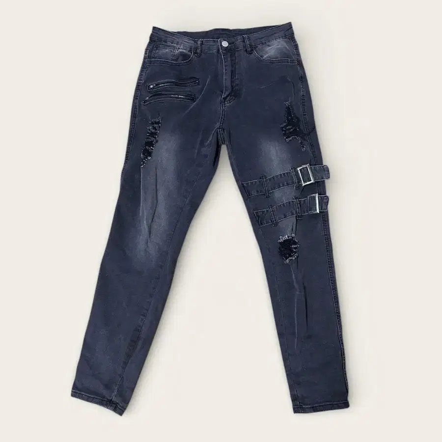 다크 그레이 스키니 데님 데미지 가공 버클 포함