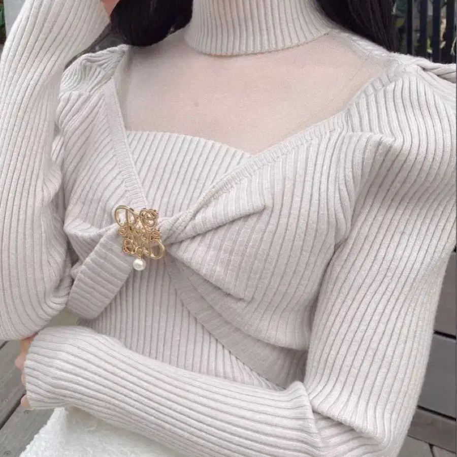 ROJITA 시어 데콜테 트위스트 리본 니트 핑크 베이지