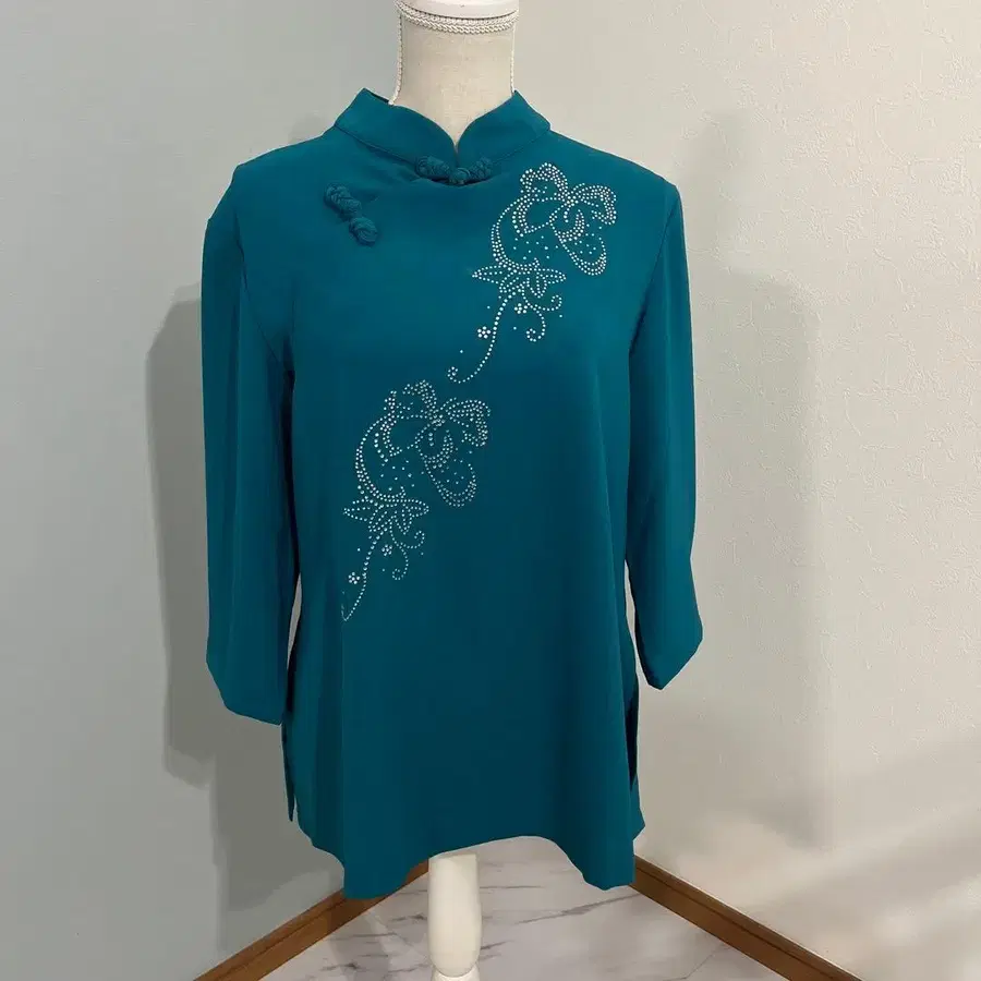 태극권 셔츠, 틸 컬러 비쥬 장식 오분 소매 셔츠