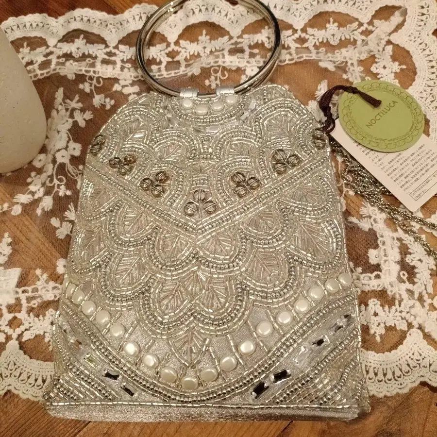 스캘럽 모양으로 배열된 다양한 비즈가 매우 귀여운 링 핸들 백.