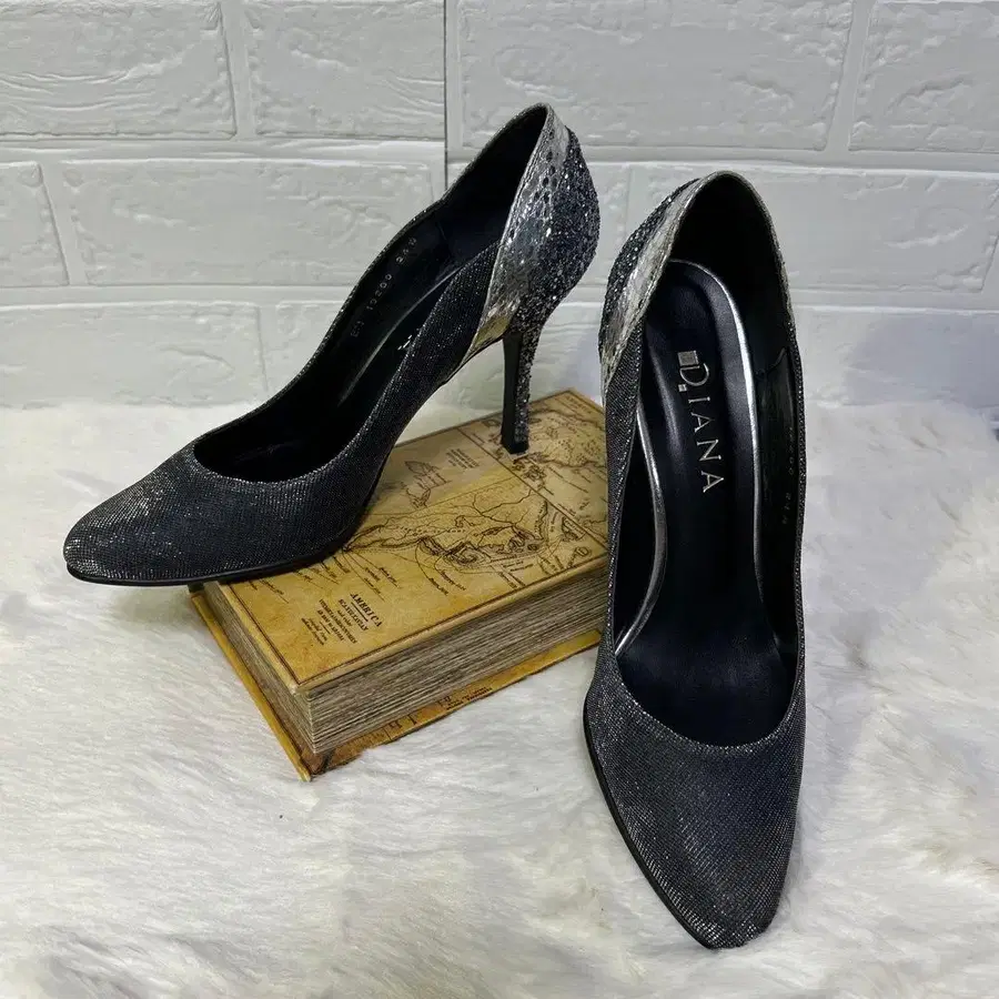 미사용급 다이애나 하이힐 펌프스 라메 블랙 여성용 드레스