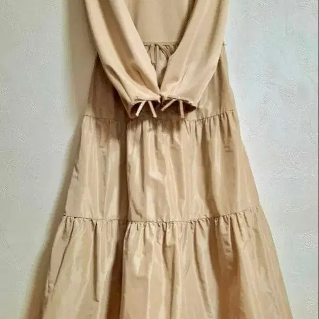 티어드 디자인의 베이지 원피스, 비쥬 포함으로 화려합니다.