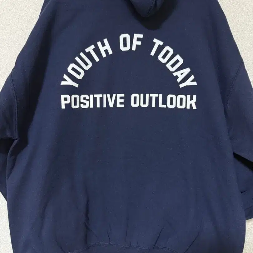 프론트에 주먹 로고와 [YOUTH OF TODAY, POSITIVE OUTLOOK] 텍스트가 특징인 네이비 후드 스웨트 셔츠입니다.