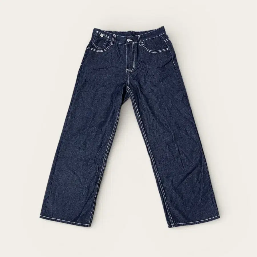 다크 네이비 와이드 레그 데님 팬츠 화이트 실 바느질