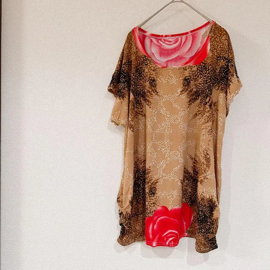 새상품급 [프리 사이즈] 꽃무늬 베이지 빨간색 튜닉 반팔 티셔츠