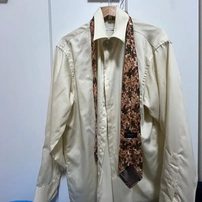 크림색 긴팔 셔츠와 꽃무늬 넥타이