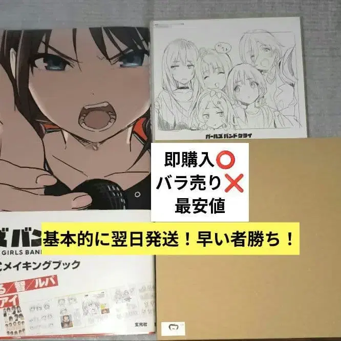 걸즈 밴드 크라이의 공식 메이킹 북과 특전 아크릴 보드, 색지입니다.