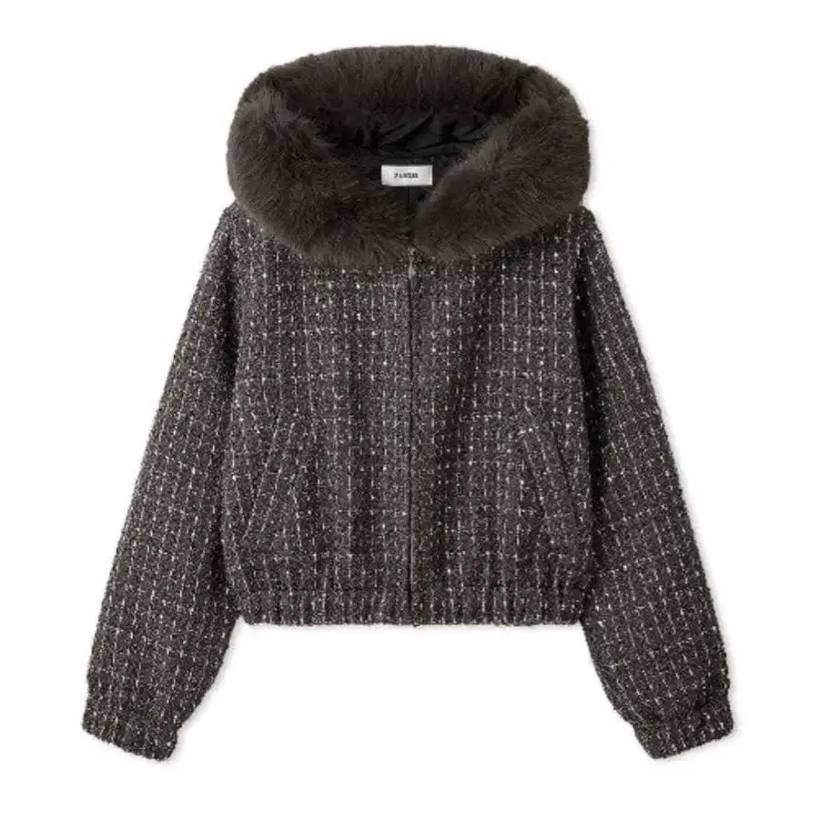 모든 색상에 오리지널로 제작한 반짝이고 화려한 트위드 원단을 사용한 퍼 트리밍 트위드 블루종입니다. 특수사 및 스팽글이 들어간 실 등 화려하고 고급스러운 실을 다수 조합하여 화려하게 완성했습니다. 깔끔한 인상의 원단이지만, 후드가 달린 블루종 형태로 트렌디한 스포티함을 MIX했습니다. 프론트의 지퍼로 입고 벗을 수 있습니다. 밑단과 소매에는 밴딩을 넣어 개더 디자인으로 마무리하여 캐주얼하게 연출했습니다. 깔끔한 스타일링에도, 캐주얼한 스타일링에도, 다양한 스타일에 맞추기 쉽게 완성했습니다. 후드에는 볼륨감 있는 퍼를 달아 고져스하게. 소두 효과도 뛰어납니다. 포켓도 있습니다. 같은 소재로 제작한 사이드 플리츠 미니 스커트 (SWFS255055)와 세트로 착용하는 것도 추천합니다.