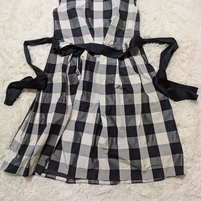블랙과 화이트 체크 무늬의 슬리브리스 미니 원피스, 허리 리본 포함으로 스타일리시합니다.