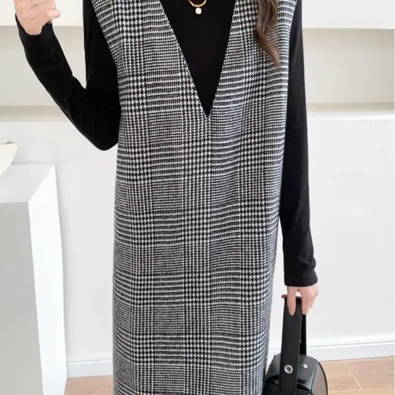 사이드 슬릿 체크 무늬 V넥 오버롤 스커트