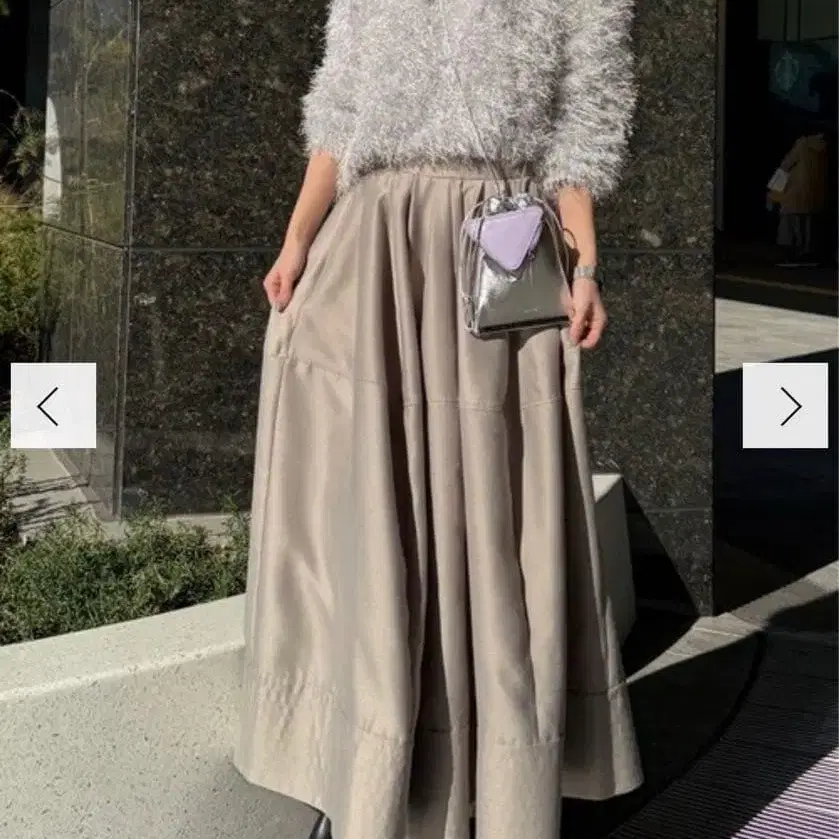 적당한 탄력감과 고급스러운 광택이 있는 소재를 사용한 엘렌딕의 롱 플레어 스커트.