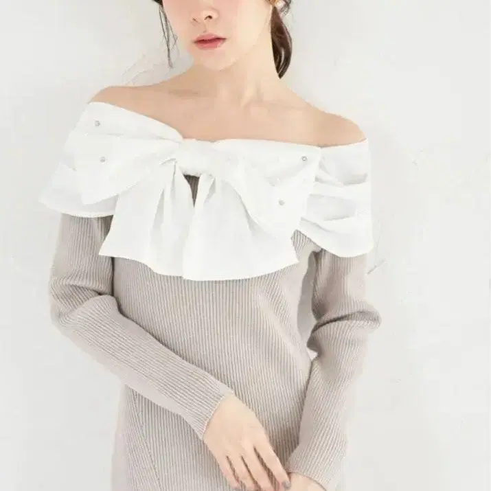 펄 비쥬 장식 빅 리본 절개 리브 니트 원피스