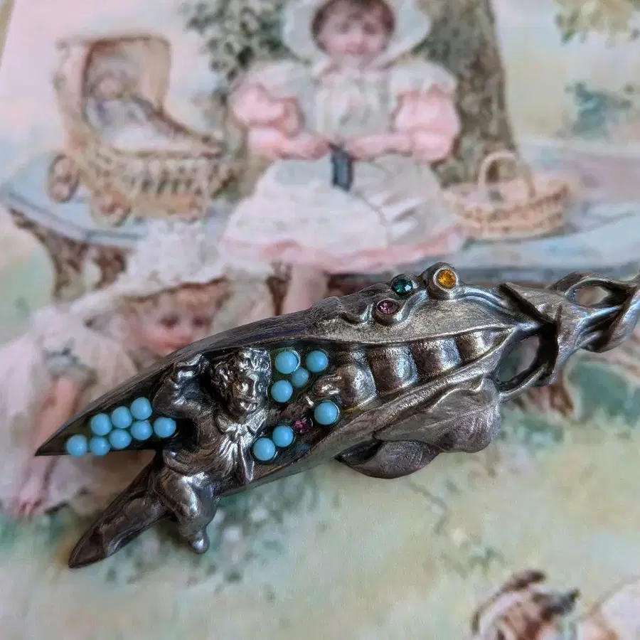 피터팬 완두콩 터콰이즈 카보숑 브로치 빈티지