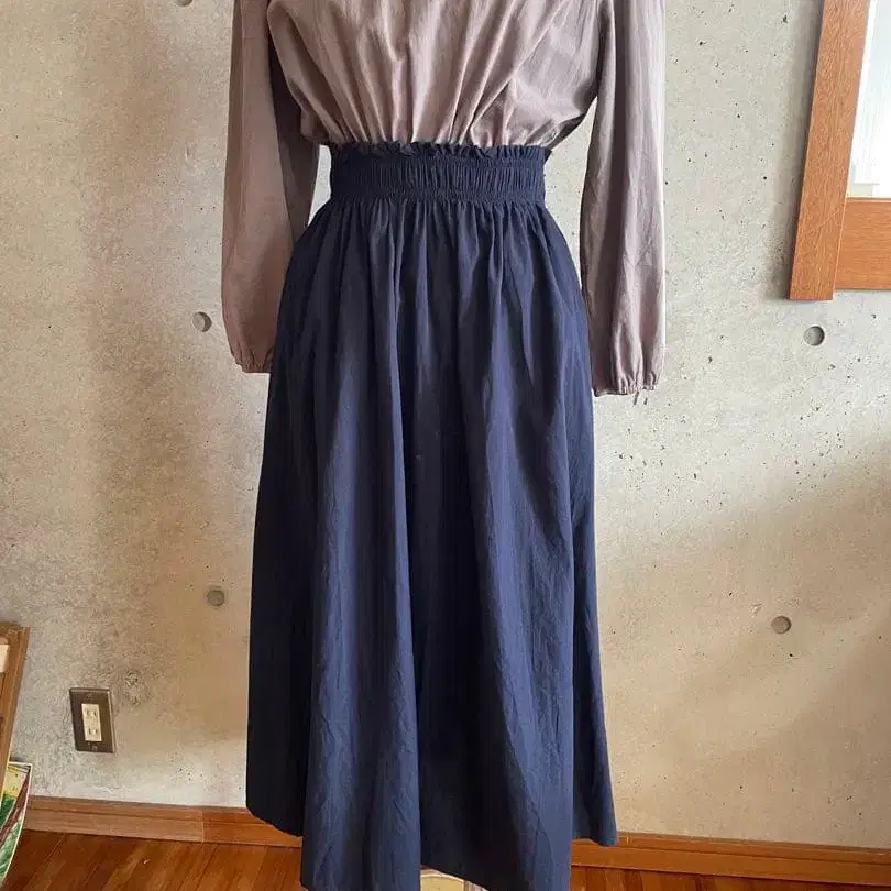 네이비 플레어 스커트 절개 원피스 긴팔 코튼 혼합
