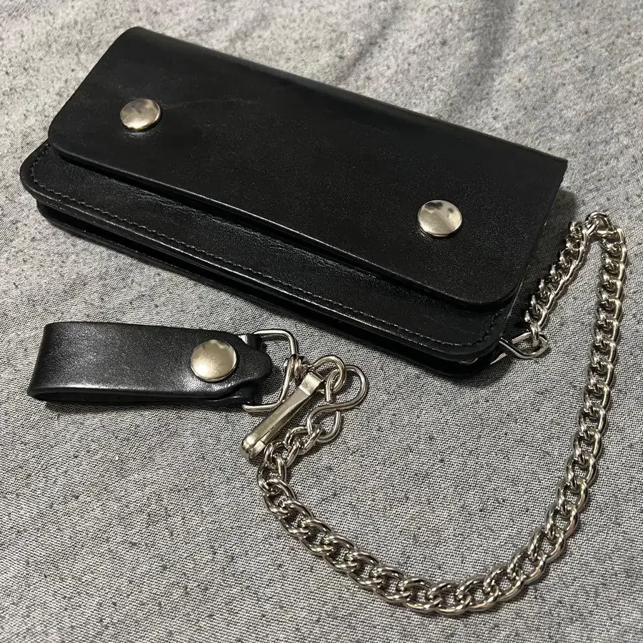 지퍼 달린 동전 지갑과 지폐 수납 공간, 카드 포켓이 있습니다. 체인이 달려 있습니다.