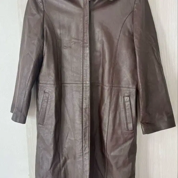 브라운 램 가죽 롱 코트, 사이드 포켓 포함.