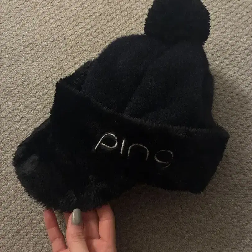 PING 블랙 퍼 니트 모자 폼폼 포함