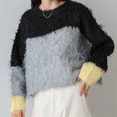 배색 디자인이 눈길을 끄는 숏 기장의 니트탑. 웨이브 라인의 절개가 화려함을 더하면서도 너무 달지 않은 성숙 큐트한 분위기로 완성됩니다. 숏 기장의 밸런스가 요즘 느낌이며, 하이웨스트 하의와도 궁합이 좋습니다. 자연스럽게 기분을 좋게 해주는 아이템입니다.