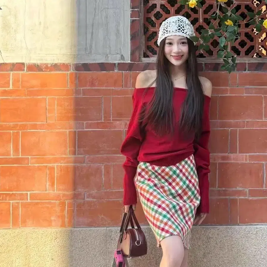 빨간색 오프숄더 스웨터와 체크 무늬 스커트 세트