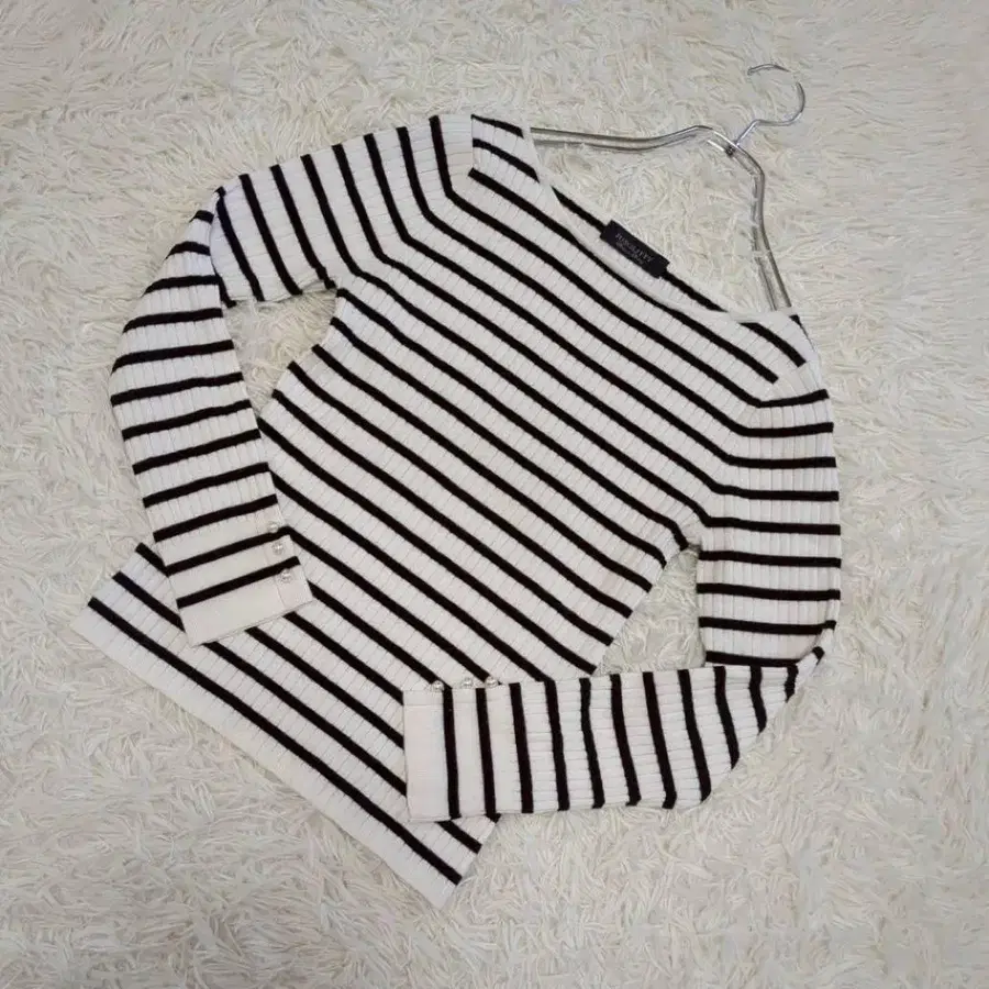 JUSGLITTY 보더 니트 보트넥 소매 펄 버튼 사이즈 2