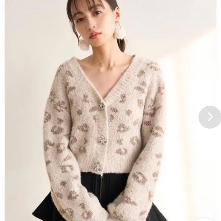 전체에 골드 라메 실을 섞어 짠 샤기 느낌의 부드러운 아이보리, 전체에 실버 라메 실을 섞어 짠 화려한 네이비, 레오파드는 SNIDEL 오리지널 빅 패턴을 사용했으며, 그레이지 베이스에 브라운 모티브, 전체에 실버 라메를 섞어 화려하고 코디하기 쉬운 디자인입니다.