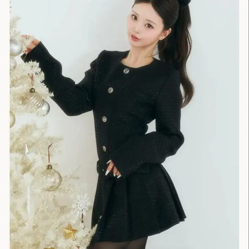 럭셔리한 반짝임을 발산하는 트위드 원단이 빛을 받아 은은하게 빛나며, 홀리데이 시즌에 딱 맞는 화려함을 연출합니다.