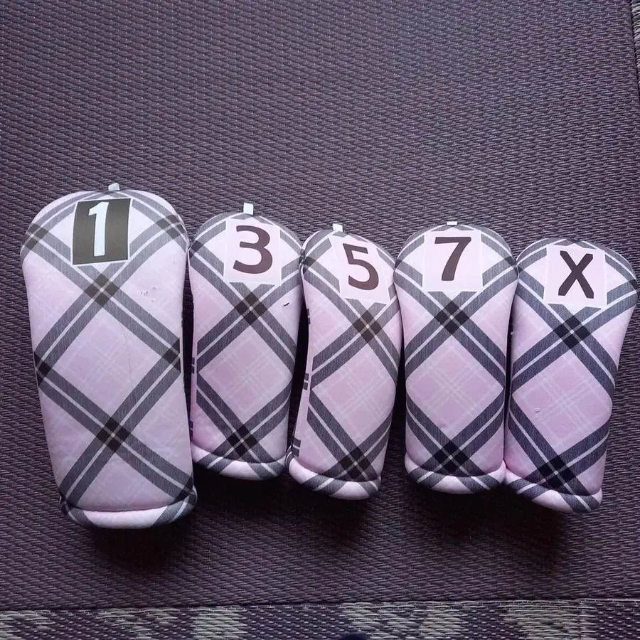 골프 헤드커버 세트 핑크 체크 무늬 5개 세트