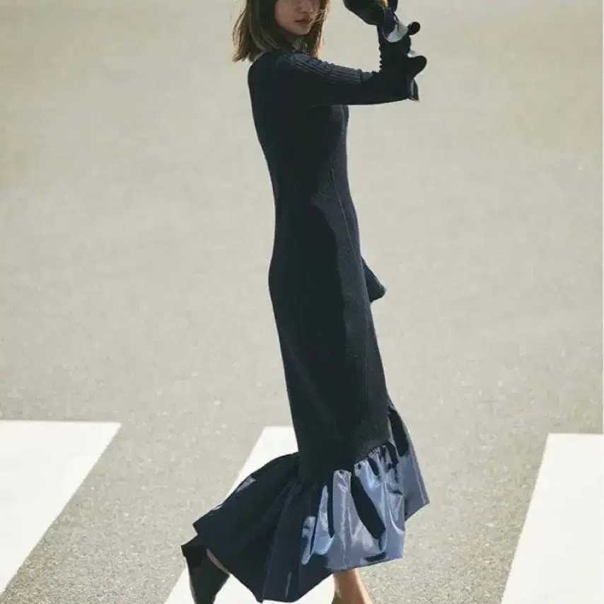 FRAY.ID 개더 프릴 니트 콤비 원피스 네이비