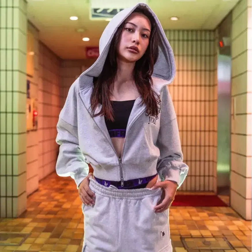 FR2 나데시코 그레이 후드 부착 크롭 맨투맨 셋업