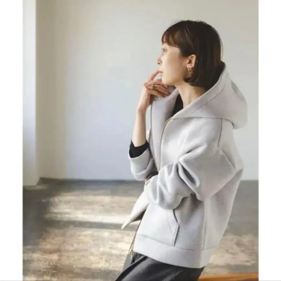 소재의 특성을 살린 빅 사이즈 후드와 입체적인 실루엣이 캐주얼하지 않고 성숙한 느낌을 연출하는 포인트입니다.