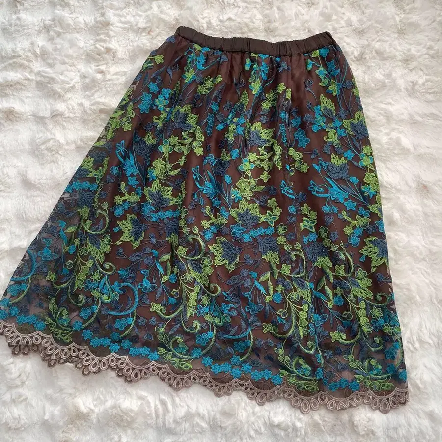 두클라쎄 꽃무늬 자수 플레어 스커트 브라운