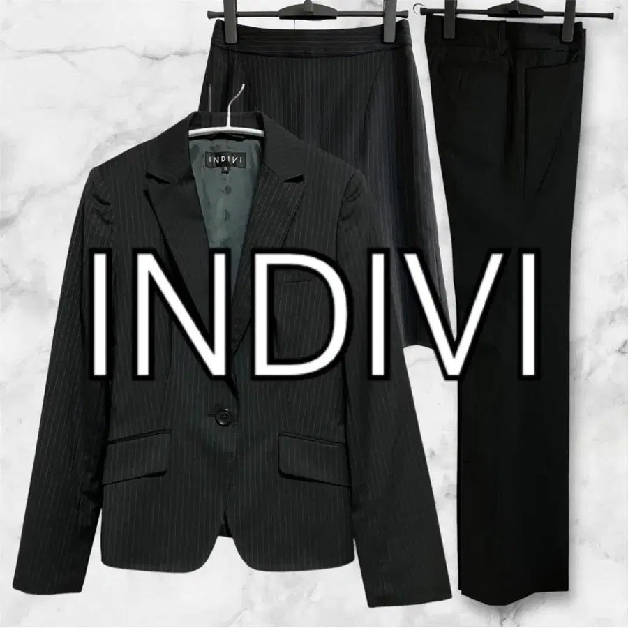 인디비 스커트&팬츠 수트 3세트 블랙 스트라이프 울 혼방