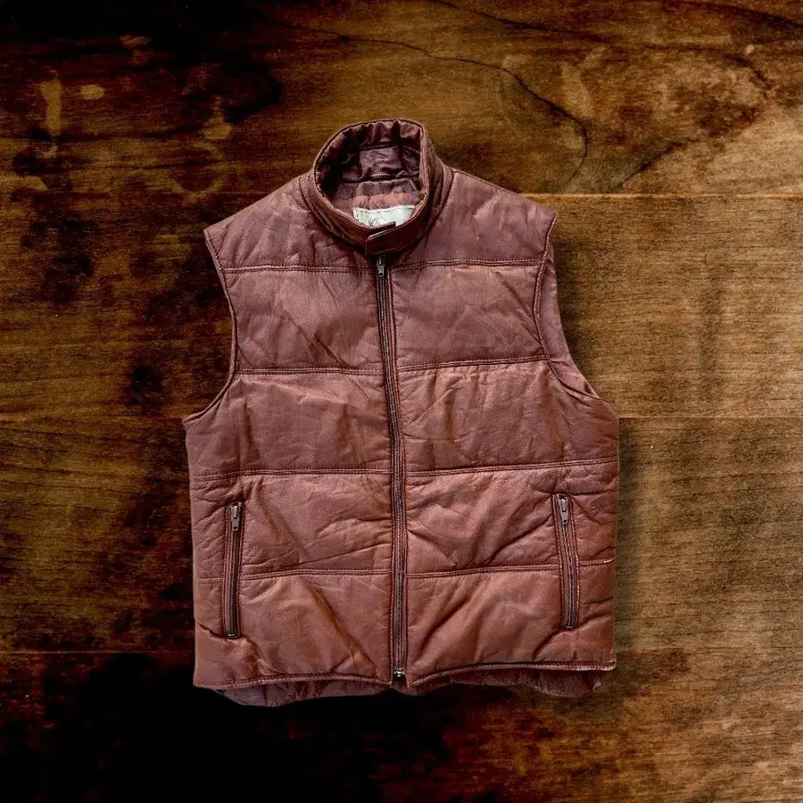 80년대 무렵의 가죽 베스트인데, 가죽 소재 표기에 [ GENUINE ]이라고 쓰여 있어 직역하면 [ 진짜 가죽 ]이라는 뜻이지만, 어떤 가죽인지는 쓰여 있지 않아 웃음이 나옵니다. 웃음.