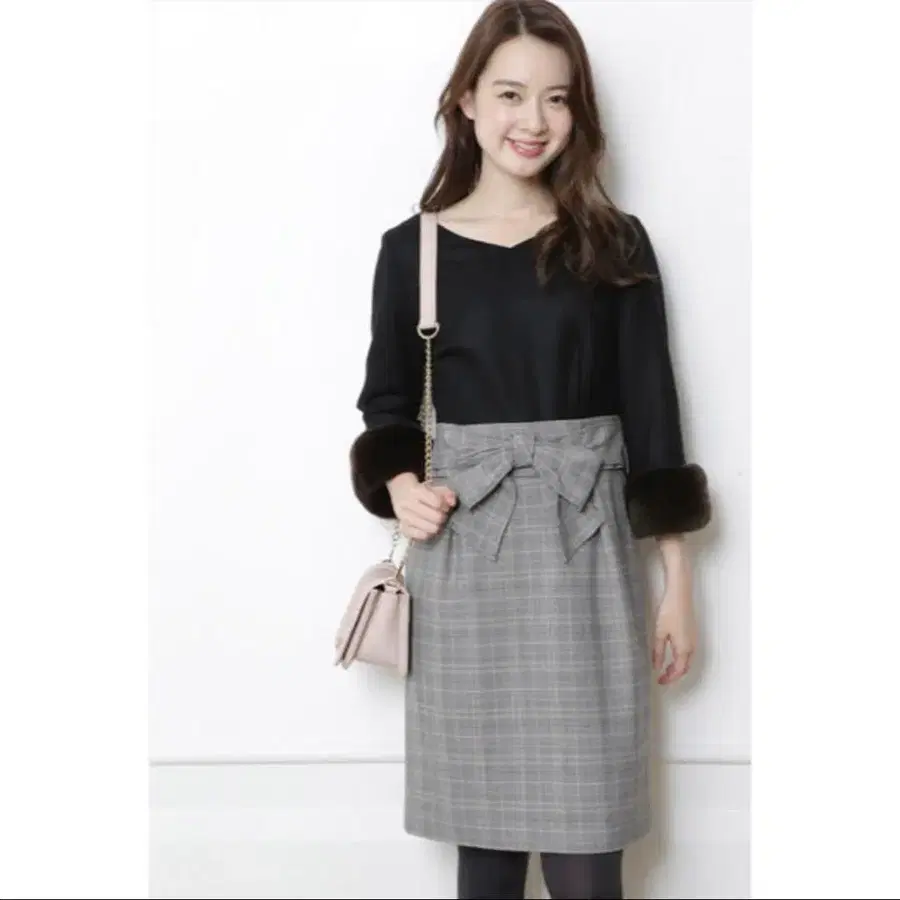 리본 벨트와 소매 퍼가 특징인 무릎 기장 원피스입니다.