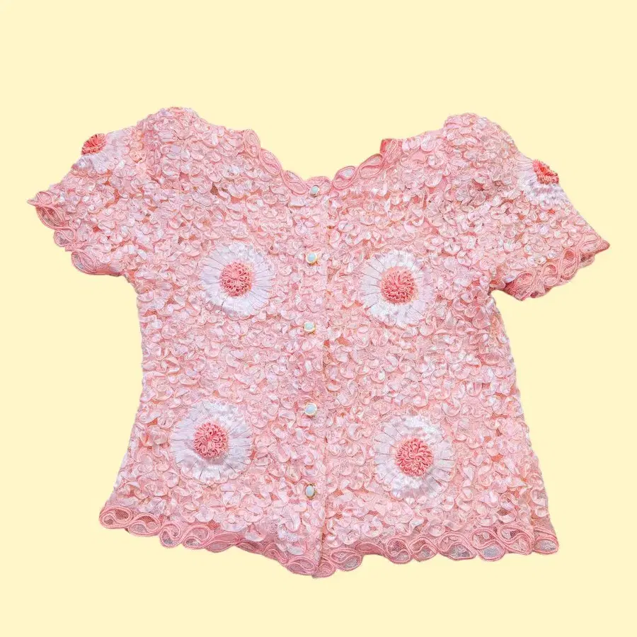 구제 플라워 반팔 가디건 vintage 포멀 살몬 핑크