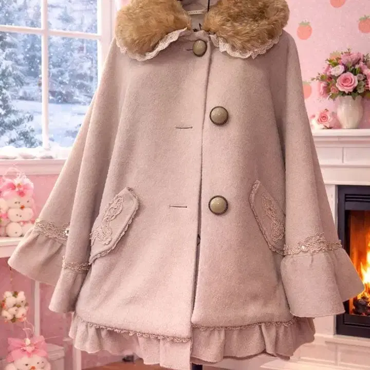 axes femme 탈부착 가능 퍼 포함 베이지 판초풍 코트 베이지/관하
