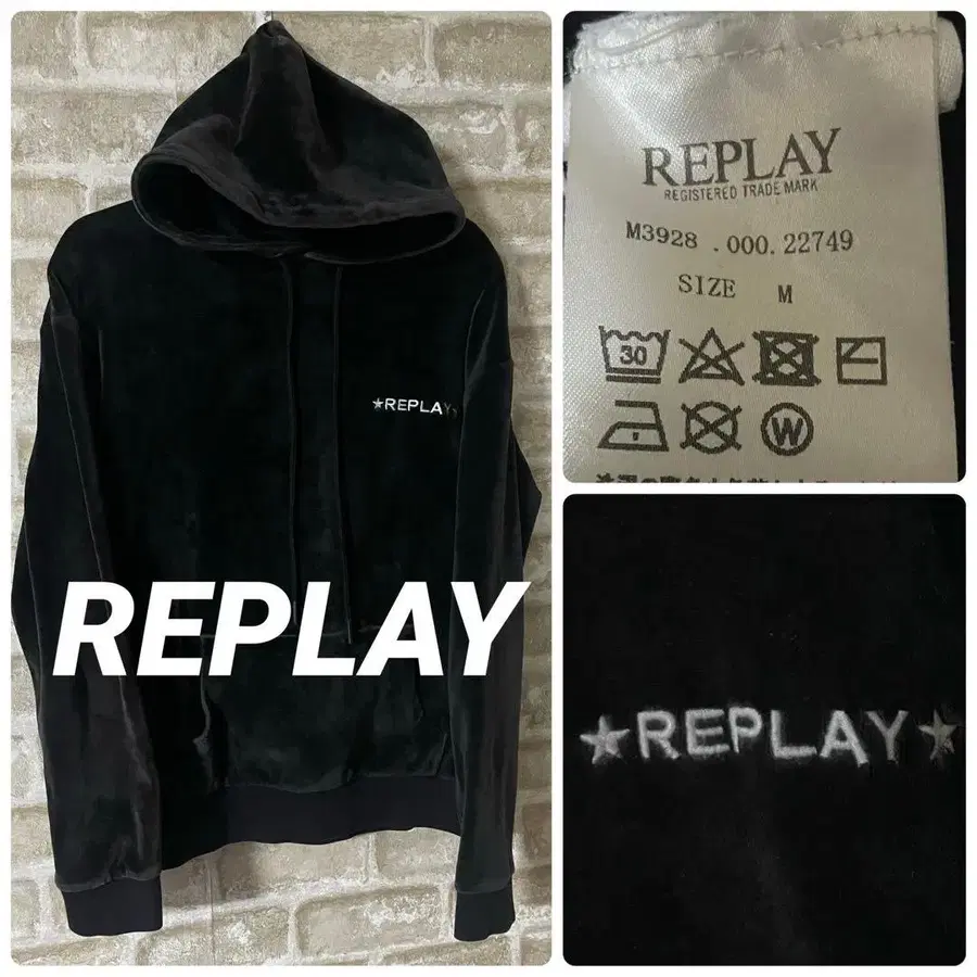 REPLAY 남성용 M 벨로아 후드티 리플레이 자수 원 포인트 벨벳