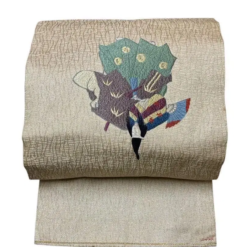 S57 나고야 오비 일본 전통 패턴 자수 인형 금은사 순수 실크