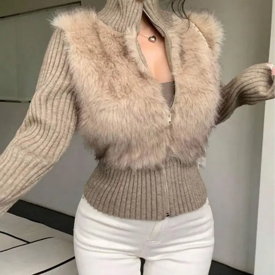 퍼 포함 리브 니트 긴팔 스웨터/베이지/하이넥