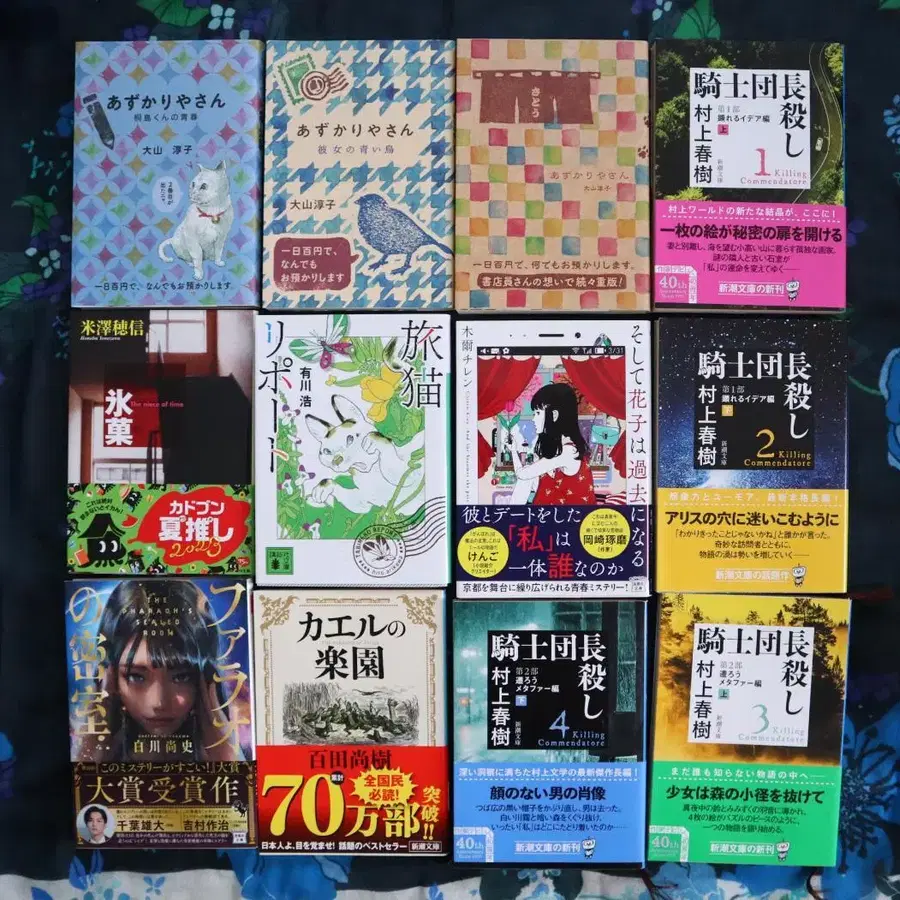 연 1회 인기 기획, 문고본 세트입니다. 이번에는 인기 작품을 포함한 12권 세트입니다. 모두 새 상품 구매 후 한 번 읽은 것으로, 먼지가 쌓이지 않도록 문이 달린 책장에 보관했던 것입니다. 모두 얼룩, 흠집, 접힌 부분 없이, 이대로 서점에서 새 상품으로 판매해도 손색없는 상태입니다. 미스터리, 판타지, 다양한 장르의 문학 작품이 갖춰진 세트이므로, 특별한 것은 물론, 책을 좋아하는 분들에게는 깊고 오랫동안 즐기실 수 있음을 약속합니다. 그 인기 작품 시리즈나, 후에 영화화된 소설, 그리고 [이 미스터리가 대단하다!] 대상 수상작도 들어 있습니다. 미지의 세계로 이어지는 멋진 여행 안내입니다. 1. [맡겨주세요 씨] 오야마 준코 저 (포플러 문고) 682엔 2. [맡겨주세요 씨 키리시마 군의 청춘] 오야마 준코 저 (포플러 문고) 682엔 3. [맡겨주세요 씨 그녀의 파랑새] 오야마 준코 저 (포플러 문고) 704엔 4. [기사단장 살해 제1부: 나타나는 이데아 편 (상)] 무라카미 하루키 저 (신초 문고) 605엔 5. [기사단장 살해 제1부: 나타나는 이데아 편 (하)] 무라카미 하루키 저 (신초 문고) 605엔 6. [기사단장 살해 제2부: 흘러가는 은유 편 (상)] 무라카미 하루키 저 (신초 문고) 605엔 7. [기사단장 살해 제2부: 흘러가는 은유 편 (하)] 무라카미 하루키 저 (신초 문고) 693엔 8. [얼음과자] 요네자와 호노부 저 (카도카와 문고) 572엔 9. [여행 고양이 리포트] 아리카와 히로 저 (코단샤 문고) 704엔 10. [그리고 하나코는 과거가 된다] 키지 치렌 저 (타카라지마샤 문고) 790엔 11. [파라오의 밀실] 시라카와 나오시 저 (타카라지마샤 문고 [이 미스] 대상 시리즈) 840엔 12. [개구리의 낙원] 모모타 나오키 저 (신초 문고) 572엔 총액 8,054엔 분